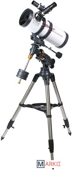Зеркало диаметром 114 мм достаточно велико, чтобы собирать много света (в этот телескоп вы сможете увидеть объекты солнечной системы во всех подробностях — таких как щель Кассини в кольце Сатурна, лунные кратеры размером ок.5 км, слабые звезды до 13 m зв. величины). Однако, габариты прибора вполне «домашние», длина трубы всего 42 см.С окуляром PL25 вы получите увеличение 40х, с которым удобно вести наземные наблюдения. При этом ближняя точка фокусировки составит всего 12 м.