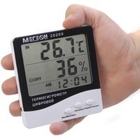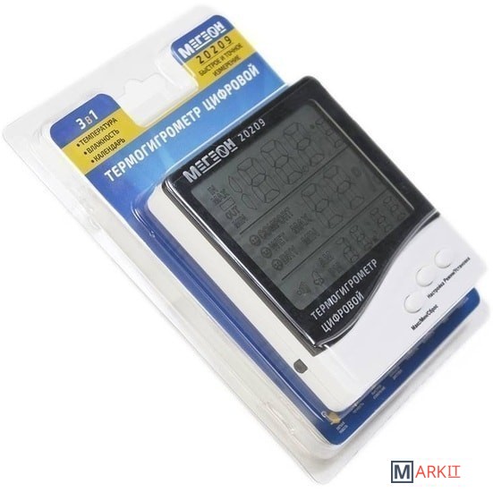Цифровой термогигрометр МЕГЕОН 20209 представляет собой двухзонный электронный термометр совмещенный с цифровым гигрометром. Прибор оснащен большим высококонтрастным жидкокристаллическим дисплеем, на котором одновременно отображаются температура, влажность и текущее время, а использование современной элементной базы позволило достичь высокой точности измерений температуры и влажности. Благодаря современному эргономичному дизайну термогигрометр идеально впишется в интерьер любого дома, а функция фиксации минимального/максимального значений температуры будет полезной при использовании прибора в загородных домах и складских помещениях.