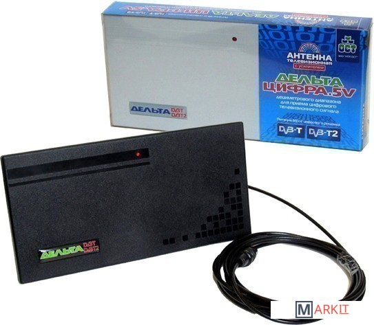 Предназначена для приёма телевизионных программ в ДМВ диапазоне цифрового телевещания через приставку DVB-T2. Антенна укомплектована усилителем для повышения уровня сигнала и компенсации его затухания в кабеле антенны. Антенный усилитель не имеет собственного источника и рассчитан на питание 5 В, подводимое по кабелю антенны от источника, встроенного в цифровую приставку DVB-T2. Ток потребления не более 35 мА.