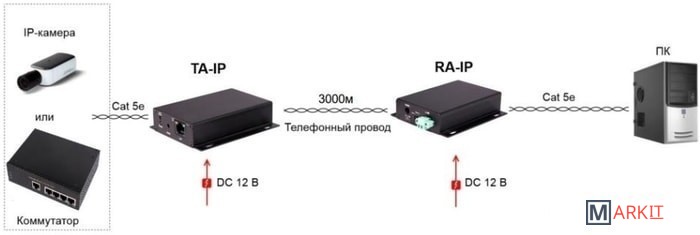 Комплект (передатчик TA-IP + приёмник RA-IP) предназначен для увеличения расстояния передачи Ethernet до 3000 м по телефонной линии, коаксиальному кабелю или кабелю витой пары со скоростью до 55 Мбит/с. Данные Ethernet могут передаваться вместе с сигналом телефонной линии, для чего потребуется дополнительный сплиттер.Устройства обеспечивают работу с широким диапазоном IP оборудования: IP-камеры, IP-телефония, IP-телевидение и пр.Скорость передачи 55 Мбит/с (300м), 10 Мбит/с (1000м), 3 Мбит/с (1500м).Передатчик: вход RJ45; выход клеммы, питание DC12В.Приёмник: вход клеммы; выход RJ45, питание DC12В/4,5 Вт. БП в комплекте. Рабочая температура -25...+50°С, Размеры 118х108х27мм (каждое устройство).