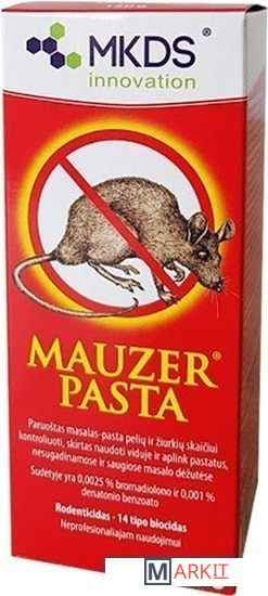 Mauzer Pasta (Маузер Паста) - готовая к использованию ядовитая приманка для контроля за численностью крыс и мышей. Предназначена для непрофессионального использования внутри и снаружи зданий.Препаративная форма: пластилинообразные пастилки.Использование:Приманку Mauzer Pasta следует поместить в местах наиболее высокой активности грызунов, например, в местах, где были обнаружены их следы или помет, около нор, мест питания и т.п. Для наилучшего эффекта рекомендуется охватить всю площадь распространения крыс и мышей. Пастилки обладают привлекательным для грызунов ароматом. Крысы и мыши, съевшие отравленную приманку, умирают через 4-6 дней от внутреннего кровотечения.Для безопасности окружающих следует осматривать контролируемый участок ежедневно и собирать павших грызунов для утилизации. В случае, если приманка съедена, необходимо увеличить ее количество и расширить площадь применения.Ядовитую приманку следует размещать в местах, недоступных для детей, домашних животных и птицы. Приманка должна быть защищена от дождя. После 35 суток использования, в большинстве случаев, грызуны будут уничтожены. Если этого не произошло, следует обратиться к специалистам для выяснения причин и принятия мер.