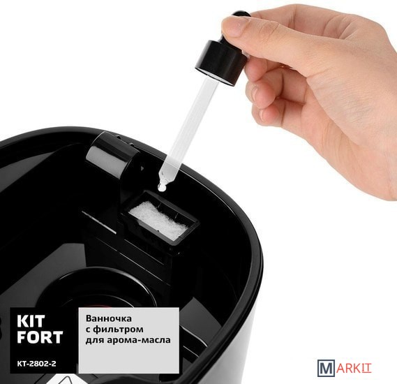 С заботой о вашем самочувствии!Ультразвуковой увлажнитель Kitfort КТ-2802 является наиболее эффективным типом увлажнителей воздуха из всех существующих. Он увлажняет воздух в помещении, создавая комфортный микроклимат для проживания людей.Подстраивается под васВ увлажнителе можно установить интенсивность тумана с помощью регулятора на передней панели.Любимый аромат у вас дома!В комплекте идёт ванночка с фильтром для ароматического масла, чтобы наполнить воздух в комнате приятным ароматом.Оберегая тишину и покой!Уровень шума увлажнителя не превышает 35 дБ. Звук не мешает спать, отдыхать и не отвлекает от домашних дел.Прост в уходеЛегко разбирается и быстро моется!