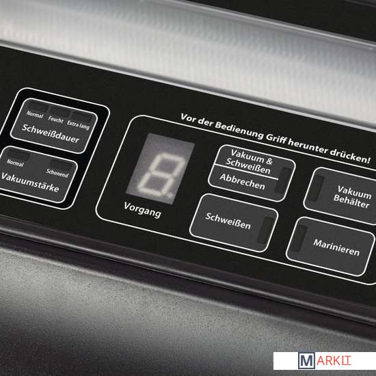 Цифровой дисплей;Время маринования: 6 минут;Двухпоршневый насос;Максимальный вакуум: 0.9 бар;Режимы запаивания:«нормальный» – сухие продукты или продукты без жидкости, «влажный» – влажные продукты или или продукты с жидкостью;«экстра долгий» – влажные продукты или или продукты с жидкостью, с экстра продолжительным временем запаивания;Режимы откачивания:«нормальный» – для обычного вакуумируемого продукта; «щадящий» – для мягких и чувствительных продуктов;Уровень шума: 68 дБ;Комплектация:шланг для вакуумных контейнеров, армированные рулоны (1 шт. 20x300 см, 1 шт. 28x300 см), 50 пакетов (20x30 см), 50 пакетов (30x40 см).