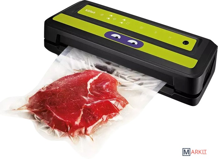 Вакууматор Kitfort КТ-1531 обеспечит долгие сроки хранения ваших любимых продуктов. Продукты, упакованные под вакуумом, сохраняют дольше аппетитный вид, вкус и полезные свойства, а портятся существенно дольше по сравнению с обычными условиями хранения.Открытый край пакета укладывается под крышку прибора, и после выбора режима, вакууматор выкачает из него воздух. В результате образования вакуума пакет плотно обжимает содержимое. Как только воздух удалён, начинается запечатка открытой стороны пакета.«Контейнер» – откачивание воздуха из контейнеров; «давление» - выбор нормального и низкого давления; «режим» - выбор режима запечатывания для сухих или влажных продуктов; «авто» - автоматическая упаковка; «запечатывание» - запечатывание шва пакета.У КТ-1531 есть режимы для вакуумирования сухих, влажных и мягких продуктов с различным временем запечатывания. Влажные продукты могут намочить край пакета, поэтому время запечатывания требуется увеличить.У КТ-1531 можно активировать режим откачки воздуха из контейнеров. Вакуумирование проиходит при помощи шланга, вставленного в фитинг вакууматора одним концом, а другим в крышку контейнера. Вы можете дополнительно приобрести набор контейнеров КТ-1500-10.С нашей техникой очень легко подружиться, потому что она не только лёгкая и функциональная, но и будто живая с весёлыми глазами. Никого не оставит равнодушным. В любой момент вы можете отклеить этот стикер без вреда для поверхности.Создаваемое разрежение (максимум): 0.8 бар.Ширина шва: 2.5 мм.Уровень шума: ≤ 80 дБ.Длина шнура: 0.9 м.