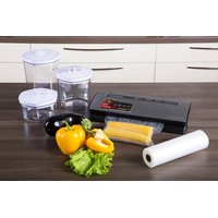 В комплекте: - 3 вакуумных контейнера объёмом: 700, 1400 и 2000 мл; - пакеты 22х30 см; - пакеты 28х40 см; - книга "50 рецептов".