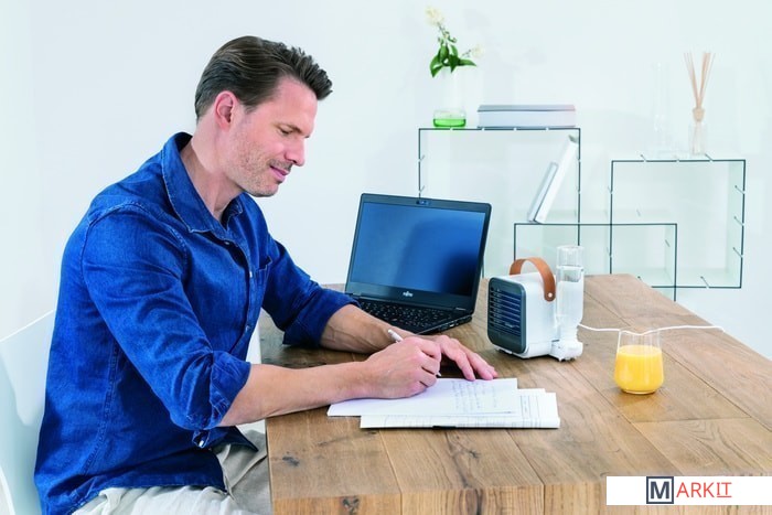 Охлаждение и увлажнение воздуха благодаря вентилятору и принципу испарения.Охлаждение до 4-х часов (работа на максимальной мощности).Можно использовать в качестве вентилятора и без бутылки с водой.В комплект поставки входят:1 бутылка 0,25 л1 испарительный фильтр1 кабель Micro-USB.