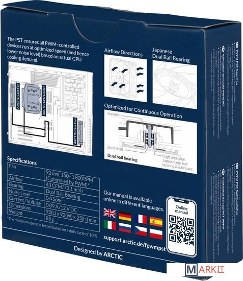 Вентилятор с поддержкой технологии PST от Arctic - возможность подключения цепочкой до 5 вентиляторов от одного 4pin разъема. Процессорный вентилятор должен быть последним в цепочке.