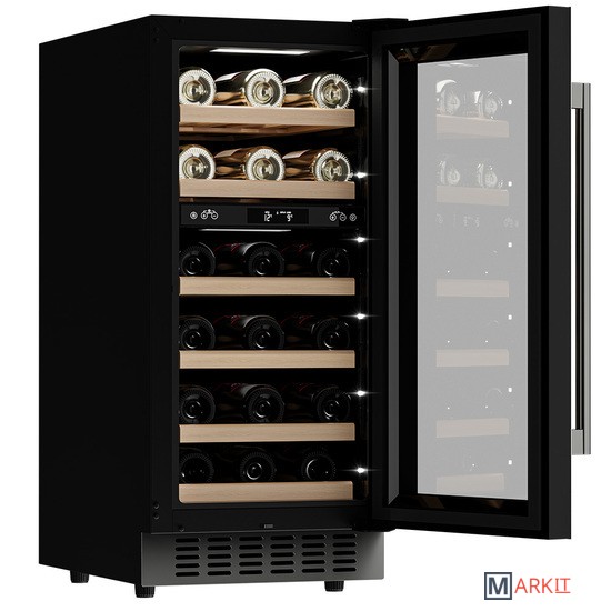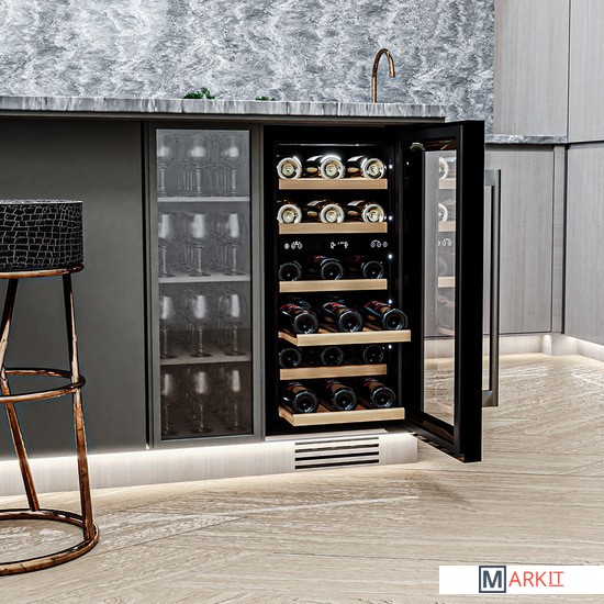 Винный шкаф Meyvel MV28-KST2Модель MV28-KST2 имеет привлекательный внешний вид, сочетающий в себе неподвластное времени очарование натуральных материалов с высокотехнологичными системами сохранения продуктов. Винный холодильник Meyvel MV28-KST2 оснащен дверью с защитой от ультрафиолетовых лучей и отлично подойдет для хранения и созревания различных сортов вин. Динамическая система охлаждения обеспечивает оптимальную температуру для вина и сохраняет необходимую влажность внутри камеры.Универсальный микроклиматКомпрессорный винный шкаф Meyvel MV28-KST2 обладает большой вместимостью и даёт возможность разместить до 28 бутылок стандартного типа Бордо (0,75 л). Располагаются они на выдвижных полках из дерева. Внутреннее пространство шкафа разделено на 2 температурные зоны, с возможностью настраивать каждую из них. Общий диапазон температуры у данной модели от +5°C до +20°C.Сенсорный дисплейБыстро задавайте необходимую температуру для содержимого и управляйте всеми функциями холодильника с помощью интуитивно-понятного расположения клавиш на сенсорном дисплее.Комфортное расположениеMeyvel MV28-KST2 отлично подходит для расположения на любой кухне. Шкаф можно встроить под столешницу, а так же, перенавесить дверь для более удобного использования (петли входят в комплект).