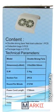 Вытяжка маникюрная с двумя двигателями - это уникальная техника, которую должен иметь каждый мастер нейл-индустрии. Ведь здоровье на первом месте, поэтому маникюрная вытяжка должна быть на каждом рабочем месте мастера маникюра. Маникюрная вытяжка работает в качестве настольного пылесоса и втягивает в себя пыль во время работы, обеспечивая чистоту рабочего места, а также воздуха, что очень важно для здоровья как мастера, так и клиента. Данная вытяжка имеет два двигателя, а это значит, что она предназначена для 2 рук. Мощность настольной маникюрной вытяжки с двумя моторами 48 ват, она потребляет совсем немного электроэнергии при этом мощная сила всасывания втягивает частицы пыли на расстоянии до 10 сантиметров. Лампа подсветка обеспечивает постоянный свет во время работы мастера. Размер вытяжки 31 на 29 сантиметров высота 13 сантиметров. Вытяжка маникюрная оснащена двумя режимами работы: бесконечность или с таймера. В режиме бесконечности включается кнопка с боку. Если мы хотим включить таймер, на панели впереди включаем кнопку ON, выбираем таймер на 5,10,20 мин. Кнопка для подсветки включается с боку. Корпус вытяжки выполнен из пластика и обтянут мягкой обивка из кожзаменителя устойчивого к растворителю. Сменные мешки от пыли ВЫТЯЖКИ, очень легко снимаются и стираются. Технические характеристики:Название продукта: вытяжка маникюрная с двумя двигателями. Мощность: 48 ват. Таймер: 5,10,20 мин. Размер: 31 X 29 X 13 см. Цвет: розовый.