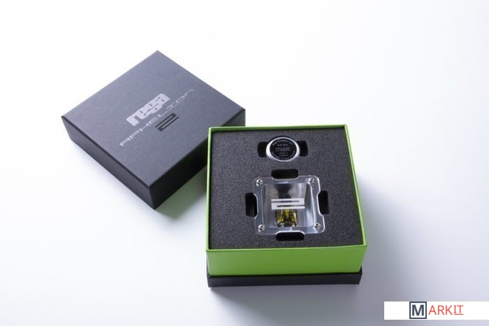 В Aphelion 2 алмазная игла с профилем «fine line» установлена на кантилевере из бора. Фирменная конструкция MC-картриджа предусматривает недемпфируемую подвижную систему с катушкой, намотанной вручную. Этот объект сверхнизкой массы подвешен на ромбовидном шарнире в поле неодимовых магнитов.Взаимное позиционирование этих элементов потребовало создания корпуса картриджа с нулевым допуском. Как утверждается, корпус изготовлен из монолитной заготовки алюминия высшего качества и анодирован в черный цвет.